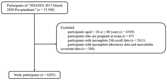 The National Health and Nutrition Examination Survey (NHANES) suspended field operations due to the coronavirus disease 2019 pandemic, resulting in an incomplete cycle for the NHANES 2019–2020; therefore, the data of the NHANES 2019–2020 must be combined with NHANES 2017–2018 for analysis. The present study was based on the NHANES 2017–March 2020 with a total of 15,560 individuals, and following exclusion criteria as shown in Figure 1, 6205 participants were finally included. The NHANES was carried out in accordance with the principles of the Declaration of Helsinki and its ethics was approved by the Institutional Review Committee of the NCHS. Due to the present study being based on the secondary analysis, it did not need additional ethics approval.