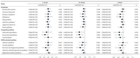 | Pervasive developmental problems | −0.38 (−1.70, 0.93) | 0.409 | −0.55 (−1.87, 0.76) | 0.569 | −1.24 (−2.46, −0.02) | 0.030 | −1.34 (−2.56, −0.13) | 0.047 | −0.49 (−1.83, 0.84) | 0.381 | −0.59 (−1.92, 0.73) | 0.469 |