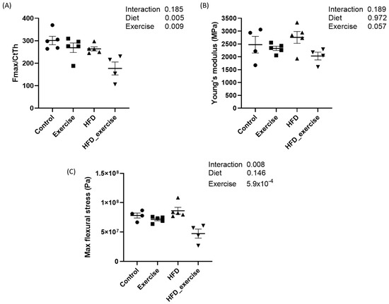 Biomechanical properties of rats treated with high-fat diet and subject to exercise compared with controls: (A) maximal force corrected by cortical thickness; (B) Young’s modulus; (C) maximal flexural stress.