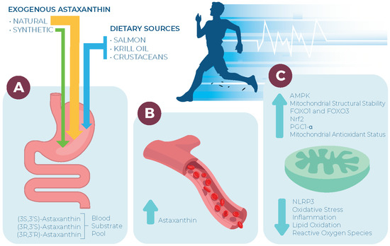 Pleiotropic effects of astaxanthin as a signaling molecule within the mitochondria. (A) Arrows from exogenous and endogenous sources denote suggested effect size on markers of interest for researchers; (B) Supplementing with endogenous and exogenous astaxanthin sources all markedly increase blood astaxanthin appearance; (C) Effects of astaxanthin on the mitochondria. The mitochondria are often only known as the ‘powerhouse’ of a cell due to the reliance on the mitochondria for adenosine triphosphate production. However, the mitochondria serve as an important focal point in improving cellular health and performance. An elevation in astaxanthin can contribute to the overall health of the mitochondria and astaxanthin has been shown to mitigate oxidative stress and upregulate antioxidant enzymes and anti-inflammatory transcription factors. These effects make astaxanthin a favorable metabolite for future projects with an aim to improve endurance performance in various populations. NLRP3, NOD-, LRR- and pyrin domain-containing protein-3; AMPK, AMP-activated protein kinase; FOXO1 and 3, forkhead box O1 and 3; Nrf2, nuclear factor-erythroid 2-related factor-2; PGC1-α, Peroxisome proliferator-activated receptor gamma coactivator 1-alpha.