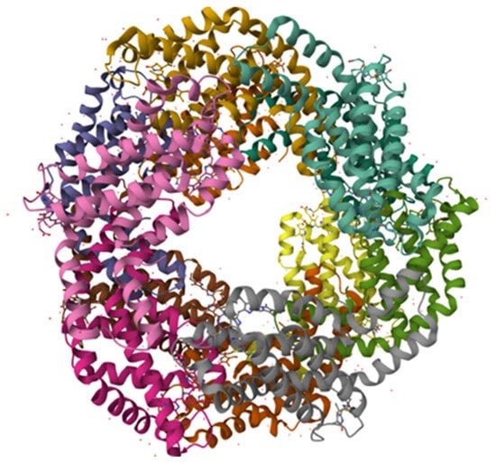 Crystal structure of C-PC from Spirulina. Reproduced from PDB database (https://doi.org/10.2210/pdb1gh0/pdb, accessed on 9 January 2024).