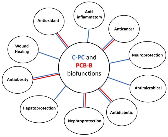 Depending on its purity grade, C-PC finds applications in the food, cosmetic, pharmaceutical, and textile industries [4,5]. Various biological functions of C-PC have been described, and there are many potential uses of C-PC-rich extracts or purified C-PC for health benefits, which will be explored in the present review [6].