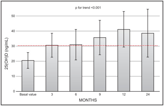 There was a continuous increase in mean 25(OH)D values (p for trend < 0.001) during the 2-year observation study. However, the mean values at month 24 (36.7 ± 15.9) were not significantly different in respect to values at month 12 (41.2 ± 11.18) (Figure 1). At the end of the study (i.e., 24 months) only 1 out 19 patients had a value less than 20 ng/mL, and 5 patients had values above 20 ng mL.