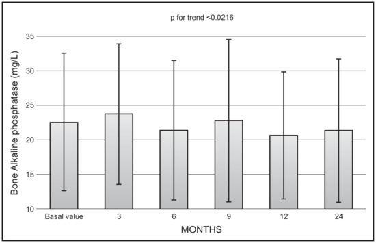 There was a significant decrease with time in mean values of bone ALP (p < 0.0216), with no significant changes in mean values between 12 and 24 months (22.9 ± 11.9 vs. 20.8 ± 20.5 mg/L) (Figure 2).