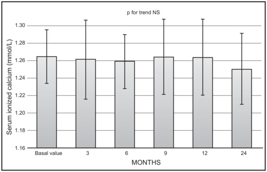 No significant changes were observed as far as mean values of serum ionised calcium (Figure 3) or creatinine were concerned. No serum ionised calcium above 1.33 nmol/L was documented.