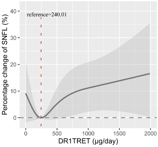 Our results indicate a significant positive association between retinol intake and sNfL levels. The J-type dose–response curve revealed that sNfL levels decreased with increasing retinol intake in subjects with dietary retinol intake below 240.01 μg, although this association was not statistically significant. However, sNfL levels increased significantly with increasing retinol intake in subjects with retinol intake exceeding 240.01 μg. The potential mechanism underlying the relationship between dietary retinol intake and serum sNfL levels may involve RBP and TTR. TTR plays a neuroprotective role at a certain concentration in the body [10,11], but its breakdown is essential in central nervous system amyloidosis [12]. Recent research indicates that retinol may stabilize TTR’s structure and decrease its decomposition rate by binding to RBP [13]. However, excessive levels of retinol have been shown to negatively regulate the expression of RBP receptors, leading to a decrease in the binding and transport of retinol with RBP and potentially accelerating the breakdown of TTR [10]. Additionally, when retinol is excessive, it could induce oxidative damage to the brain.