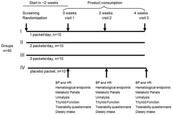 At each visit, subjects reported to the study center in the early morning hours (e.g., 6:00–8:00 a.m.) in a 10-hour fasted state and self-collected a mid-stream urine sample for subsequent analysis. Subjects then rested quietly for 10 min before heart rate and blood pressure (systolic/diastolic) were taken using an automated point-of-care sphygmomanometer (OMRON HEM 907XL, OMRON Healthcare, Tokyo, Japan). No EKG assessment was performed, which may be considered a limitation of this study. Height and weight were measured using a calibrated platform scale with a stadiometer (TANITA, ELECTRONIC PHYSICIAN SCALE WB-3000, Tokyo, Japan). Subjects reviewed their medication/dietary supplement use with an investigator. A blood sample was collected and analyzed as described below. Subjects were randomized to one of four groups (See Figure 1) to consume either (1) one stick of product, (2) two sticks of product, (3) three sticks of product, or (4) one stick of flavor-matched and sugar-free Crystal Light (placebo) daily for four total weeks. Subjects were instructed to thoroughly mix the powder into 16 ounces of water and consume in the morning, afternoon, and/or evening, while in a rested state and not specific to an acute bout of exercise. During visit 2 (at the 2-week midpoint), the subject repeated the procedures and returned the remaining study product and their study journal. Subjects received a new study journal and study product for the second half of the study. At visit 3, subjects repeated the above procedures and completed a product tolerability questionnaire.
