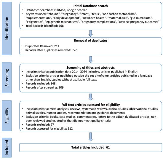 A total of 61 scientific sources were collected. Although this article is not exhaustive, it is a summary of the most important and recent information on the effects of maternal choline intake on child development and health. Figure 1 is an illustration of the search process for this narrative review.