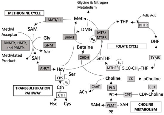One carbon metabolism metabolic pathways []. Folate cycle metabolites and enzymes: 5,10-CH2-THF, 5,10-methylenetetrahydrofolate; 5mTHF, 5-methyl-tetrahydrofolate; DHF, dihydrofolate; DHFR, dihydrofolate reductase; MTHFR, 5,10-methylenetetrahydrofolate reductase; TYMS, thymidylate synthase. Methionine cycle metabolites and enzymes: DMG, dimethylglycine; Hcy, homocysteine; Met, methionine; SAH, S-adenosylhomocysteine; SAM, S-adenosylmethionine; Sar, sarcosine; Gly, glycine; AHCY, S-adenosyl-L-homocysteine hydrolase; BHMT, betaine-homocysteine S-methyltransferase; CHDH, choline dehydrogenase; GNMT, glycine N-methyltransferase; MATI/III, methionine adenosyltransferase; MTR, methionine synthase; MTRR, methionine synthase reductase; DNMTs, de novo and maintenance DNA methyltransferases; HMT, histone methyltransferase; PRMT, protein arginine methyltransferase. Transsulfuration pathway metabolites and enzymes: Cth, cystathionine; Cys, cysteine; Hse, homoserine; CBS, cystathionine β-synthase; CTH, cystathionine γ-lyase; Ser, serine. Choline metabolites and enzymes: CDP–choline, cytidine diphosphate-choline; PC, phosphatidylcholine; pCholine, phosphocholine; PE, phosphatidylethanolamine; ACh, acetylocholine; CCT, CTP:phosphocholine cytidylyltransferase; ChAT, choline acetyltransferase; CK, choline kinase; CPT, cholinephosphotransferase; PLD, phospholipase D; PEMT, phosphatidylethanolamine N-methyltransferase. Coenzymes: vitamin B2, B6 and B12.