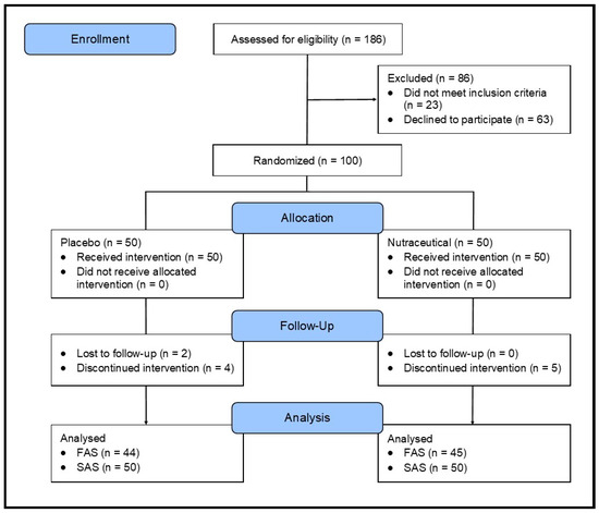 Volunteers were recruited through social media and e-mail databases between May 2023 and October 2023. Eligible participants were randomly assigned to one of two groups (nutraceutical or placebo; 1:1 ratio). A randomization calculator was utilized to ensure sequence concealment with the randomization structure involving 10 randomly permuted blocks, with 10 participants per block. A participant identification number was allocated based on the order of participant enrollment. The randomization sequence was generated by an investigator not directly involved in recruiting volunteers, and bottle codes were stored by the study sponsor and revealed after all data were analyzed. All softgels were packaged in identical bottles. Study investigators were blind to the treatment allocation until all outcomes were collected and a blind review was completed.