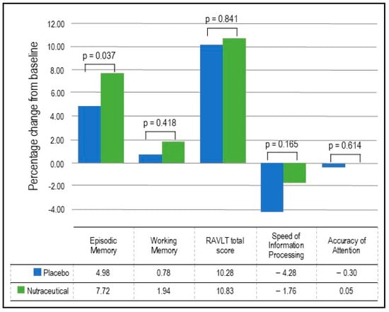 - Episodic Memory: As detailed in Table 3 and Figure 2, the GLMM analysis revealed a statistically significant group × time interaction in episodic memory (p = 0.037). In the nutraceutical group, there was a statistically significant 7.72% increase in episodic memory from baseline to week 12 (p < 0.001) compared to a statistically significant but smaller 4.98% increase in the placebo group (p < 0.001).