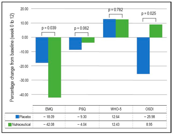 - EMQ: As demonstrated in Table 4 and Figure 3, based on the GLMM, there was a statistically significant group × time interaction in EMQ scores (p = 0.039). In the nutraceutical group, there was a statistically significant 42.08% decrease in EMQ scores from baseline to week 12 (p < 0.001) compared to a statistically significant but smaller 18.09% decrease in the placebo group (p = 0.022).