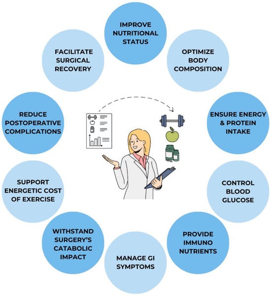Preoperative nutritional intervention in CD patients has multiple purposes: improving nutritional status, optimizing body composition, ensuring adequate caloric and protein intake, controlling blood glucose, providing immunonutrients, managing gastrointestinal symptoms, overcoming barriers preventing food intake, withstanding the catabolic impact of surgery, and supporting the energetic cost of exercise interventions in the context of a multimodal prehabilitation program. The ultimate goal is to reduce postoperative complications and facilitate surgical recovery [,] (Figure 1).