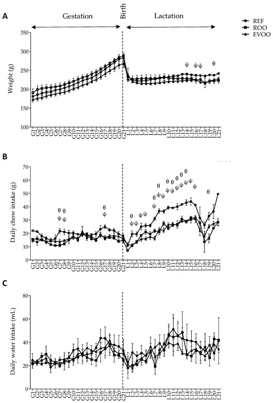 The impact of the maternal diet on growth and food and water intake along the study. The time course changes in animal weight (A), daily chow intake (B) and daily water intake (C). The first 3 weeks correspond to the gestation period and the following 3 weeks to the lactation period. The vertical dashed line represents the birth day. Results are expressed as mean ± SEM (n = 4–6). θ p < 0.05 ROO vs. EVOO. Ψ p < 0.05 EVOO vs. REF.