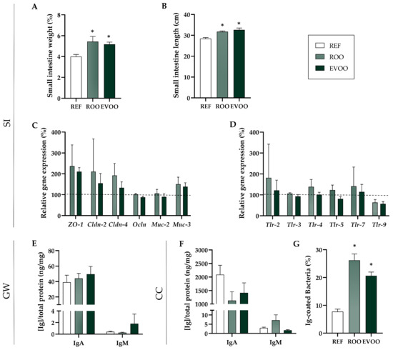 IgA and IgM levels were analyzed in cecal content and GW. There were no differences in either of them between the study groups (Figure 2E,F). However, the proportion of bacteria bound to Ig (Ig-CB) in cecal samples was significantly higher in both the ROO and the EVOO group (Figure 2G).