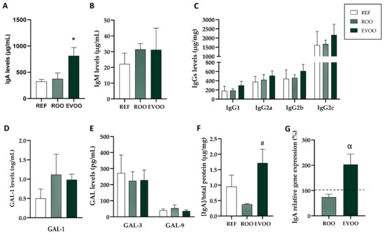 EVOO effects on breast milk. IgA (A), IgM (B) and IgG (C) levels in breast milk. Galectins 1 (D), 3 and 9 (E) levels in breast milk. IgA levels (F) and relative gene expression of IgA (G) in mammary gland by real-time PCR, calculated with respect to REF, which corresponded to 100% of transcription (dashed line). Results are expressed as mean ± S.E.M (n = 4–6). * p < 0.05 vs. REF, # p < 0.05 vs. ROO. α p < 0.07 vs. REF.