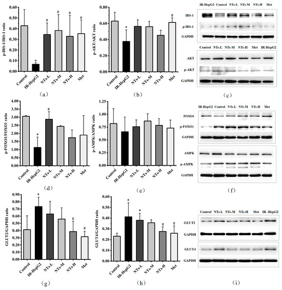 3.8. The Effect of Exogenous NTs on Insulin Signaling Pathway Proteins in IR-HepG2 Cells