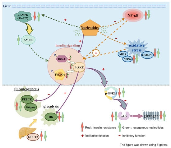 Song, L.; Li, Y.; Xu, M. Exogenous Nucleotides Ameliorate Insulin Resistance Induced by Palmitic Acid in HepG2 Cells through the IRS-1/AKT/FOXO1 Pathways. Nutrients 2024, 16, 1801. https://doi.org/10.3390/nu16121801