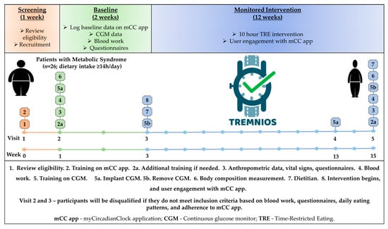 TREMNIOS is a multicenter prospective single-arm pilot clinical trial with a pre–post intervention design that was performed in a Polish population of adult patients with MetS and an eating period of ≥14 h per day. Details on the trial protocol were described previously []. The essential components of the study design and its timeline are depicted in Figure 1.