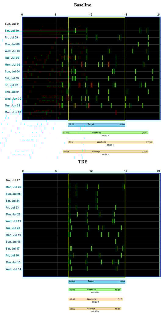 “Feedogram” raster plot obtained by the myCircadianClock application in an example study participant during baseline period (the upper part of figure) and during time-restricted (TRE) intervention (the lower part of figure).