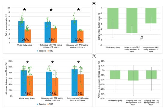 Changes in mean daily eating window duration (A) and adherence to logging on mCC app (B) for the whole study group of patients with metabolic syndrome undergoing TRE and two patient subgroups depending on mean TRE daily eating window duration (>10 h or ≤10 h) within groups (left panels) and between groups (right panels). The left panels include data points for individual study participants and the percentage change in mean values between the baseline and TRE intervention periods are shown. Abbreviations: mCC app—myCircadianClock application; TRE—time-restricted eating; *—p < 0.05; #—0.05 ≥ p < 0.1.