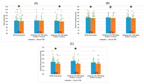 Changes in body weight (A), waist circumference (B), and systolic blood pressure (C) for the whole study group of patients with metabolic syndrome undergoing TRE and two patient subgroups depending on mean TRE daily eating window duration (>10 h or ≤10 h). Data points for individual study participants and the percentage change in mean values between the baseline and the end of TRE intervention are shown. Abbreviations: TRE—time-restricted eating; *—p < 0.05; #—0.05 ≥ p < 0.1.