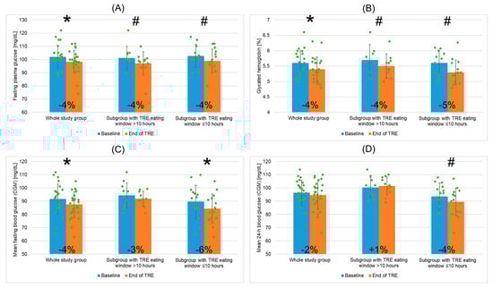 Changes in fasting plasma glucose (A), glycated hemoglobin (B), mean fasting blood glucose obtained by CGM (C), and mean 24 h blood glucose obtained by CGM (D) for the whole study group of patients with metabolic syndrome undergoing TRE and two patient subgroups depending on mean TRE daily eating window duration (>10 h or ≤10 h). Data points for individual study participants and the percentage change in mean values between the baseline and the end of TRE intervention are shown. Abbreviations: CGM—continuous glucose monitor; TRE—time-restricted eating; *—p < 0.05; #—0.05 ≥ p < 0.1.