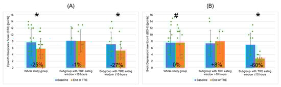 Changes in Epworth Sleepiness Scale (A) and Beck Depression Inventory-II (B) for the whole study group of patients with metabolic syndrome undergoing TRE and two patient subgroups depending on mean TRE daily eating window duration (>10 h or ≤10 h). Data points for individual study participants and the percentage change in mean values between the baseline and the end of TRE intervention are shown. Abbreviations: BDI-II—Beck Depression Inventory-II; ESS—Epworth Sleepiness Scale; TRE—time-restricted eating; *—p < 0.05; #—0.05 ≥ p < 0.1.
