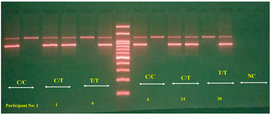 Post-PCR, the amplification products were visualized on a 2% agarose gel stained with ethidium bromide. Each sample underwent duplicate reactions to determine the presence of the C and T alleles. Identification of an 869-base pair (bp) band in both duplicate reactions signified a C/T heterozygous genotype, while detection of the 869-base pair band in either the C or T allele-specific reaction indicated homozygous C/C or T/T genotypes, respectively (Figure 2). An internal control involving primers for the mitochondrial genome, specifically the L strand primer 5′-CTCC ACCATTAGCACCCAAAGC-3′ and the H strand primer 5′-CCTA TTTGTTTATGGGGTGATG-3′, was included to generate a 250-base pair product, ensuring the validity of each reaction. All of the assays were performed in duplicate, alongside two negative controls.