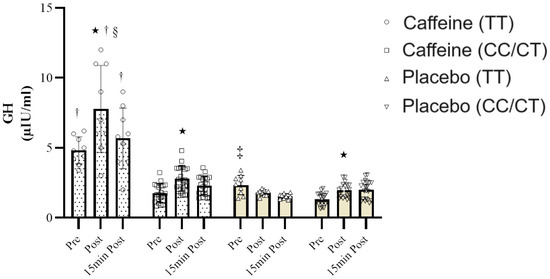 Under PL conditions, the only significant difference in GH levels between TT and TC/CC genotypes was detected prior to testing (p = 0.035). Furthermore, post-test GH concentrations in the TT genotype were significantly elevated compared to the placebo (p = 0.05), yet no such difference was observed for the TC/CC genotype between the CAF and PL conditions. Additionally, an independent samples t-test with Bonferroni correction was used to investigate differences within the groups concerning GH concentration. The findings indicate a significant rise in post-test GH levels in the TT genotype under CAF conditions compared to pre-test levels (p ≤ 0.05). However, for individuals carrying the TC/CC genotypes, significant increases in GH were noted both post-test and 15 min post-test in comparison to pre-test levels when both CAF and PL were consumed (p ≤ 0.05).
