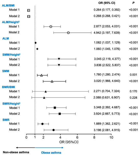 Associations of BMR and muscle mass with obese asthma. Model 1: unadjusted model. Model 2: adjusted for age and sex. ALM: appendicular lean mass; BMI: body mass index; BMR: basal metabolic rate; OR: odds ratio; SMM: skeletal muscle mass.