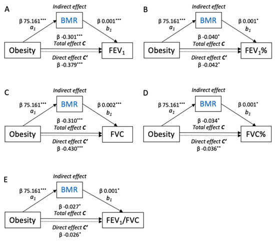 Path model diagrams with the results of the mediation analysis. (A) FEV1, (B) FEV1%, (C) FVC, (D) FVC%, and (E) FEV1/FVC. Path model showing the effect of obesity on the measurements of the lung function as mediated by the BMR. Total β effect (path c) represents the effect of obesity on the lung function with no mediators in the model. Direct β effect (path c’) represents the effect of obesity on the lung function when the BMR was included in the model. Indirect effects (path a1b1) represent the effect of obesity on the lung function through the BMR. These models were adjusted for age, sex, ICS dosage, and SAE in the past year. The figures show unstandardized β regression coefficients (* p < 0.05, ** p < 0.01, *** p < 0.001).