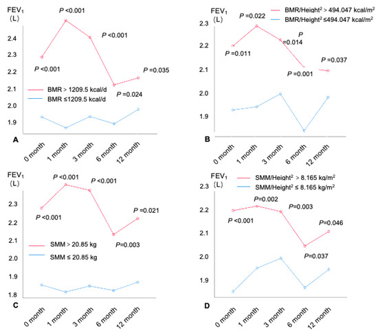 The spirometry was conducted at baseline, the first month, the third month, the sixth month, and the twelfth month. A total of 542 subjects with asthma completed the 12-month follow-up (Figure 1). The differences in the spirometers in patients with different BMR and muscle mass levels (by the cutoff values shown above) were compared (Figure 4 and Figures S6–S8). An age–sex-adjusted ANOVA performed on the BMR and muscle mass revealed that, from the baseline to the twelfth month at the end of the follow-up, patients with higher BMRs (all p < 0.05), BMRs/Height2 (all p < 0.05), SMM (all p < 0.05), SMM/Height2 (all p < 0.05), ALM (all p < 0.05), and ALM/BMIs (all p < 0.05) had consistently increased FEV1 values compared with patients with lower BMRs (Figure 4). Similar results were also found for the spirometers, including the %FEV1 (Figure S6), FVC (Figure S7), and %FVC (Figure S8).