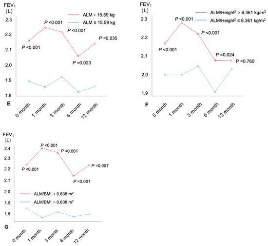 FEV1(L) at each visit within the 12-month follow-up by BMR and muscle mass. (A) BMR, (B) BMR/Height2, (C) SMM, (D) SMM/ Height2, (E) ALM, (F) ALM/Height2, and (G) ALM/BMI. FEV1: forced expiratory volume in 1 s; SMI = ALM/Height2. ALM: appendicular lean mass; BMI: body mass index; BMR: basal metabolic rate; SMI: appendicular skeletal muscle index; SMM: skeletal muscle mass.