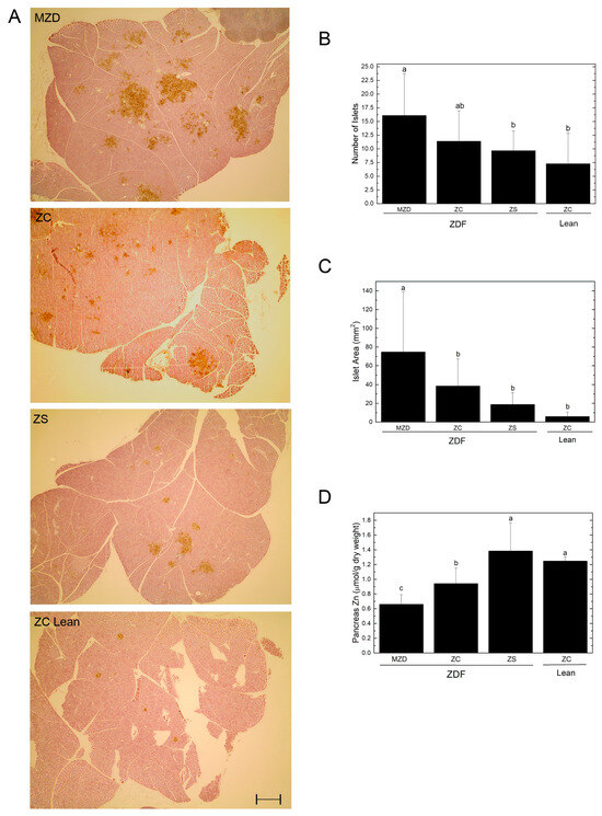 Pancreatic islet insulin immunostaining (A), number of islet cells (B), islet cell area (C) and pancreatic zinc concentrations (D). Representative images show pancreatic islets identified by insulin immunostaining and visualized by DAB in brown. Scale bar = 0.5 mm. Values are means ± SD, n = 10 except n = 9 for ZS ZDF and n = 7 for ZC Lean. Different superscript letters indicate significant differences (p < 0.05) among means. Abbreviations: DAB, 3,3′-diaminobenzidine; Lean, lean (+/?) control rats; MZD, marginal zinc-deficient diet; ZC, zinc control diet; ZDF, Zucker diabetic fatty rats; and ZS, zinc-supplemented diet.