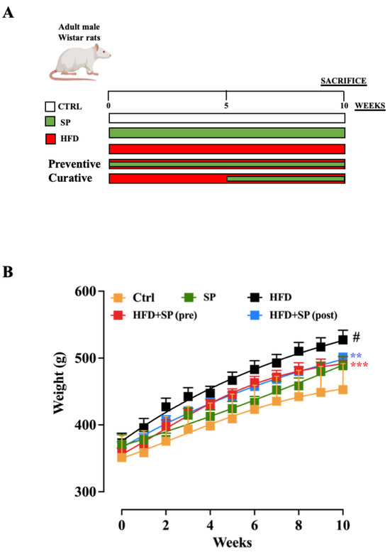 (A) Experimental design related to the animal model of HFD-induced hyperlipidaemia. (B) Weight changes in mice fed standard chow diet (ctrl), spirulina diet (SP), high fat diet (HFD), HFD + SP (pre-treatment) and HFD + SP (post-treatment). Spirulina was administered daily by oral gavage at a dose of 650 mg/kg (suspended in 1 mL water) during the 5-week (curative protocol, i.e., post-treatment) or 10-week (preventive protocol, pre-treatment) experimental period. Body weight was measured weekly for 10 weeks. Data represent the mean ± SEM of 8 mice per group. Two-way ANOVA followed by Tukey’s multiple comparisons test was performed to test for differences among the groups. # p < 0.0001 vs. ctrl group; ** p < 0.01 and *** p < 0.001 vs. HFD group.