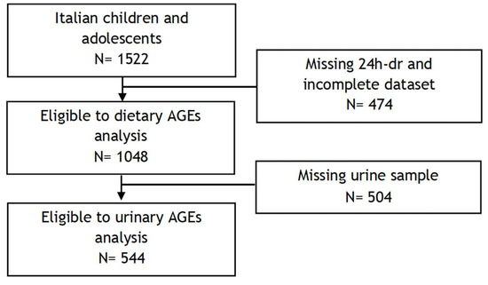 The I.Family project (http://www.ifamilystudy.eu, accessed on 7 June 2024), aimed to assess the determinants of eating behaviour in children and adolescents from eight European countries and related health outcomes, was built on the IDEFICS study (http://www.ideficsstudy.eu, accessed on 7 June 2024), which was established in 2006 and followed up in 2013–2014 [24,25]. Briefly, the Italian cohort of the I.Family project was composed of 1522 children and adolescents who underwent a general examination module [25]. A total of 1048 children and adolescents, with available sociodemographic and anthropometric information and at least one completed 24 h dietary recall, were included in the analysis of dAGEs. Among them, 544 participants who provided a fasting urine sample for AGE determination were included in the analysis of urinary AGEs. The flow chart of the selection process is shown in Figure 1. Details of the general design, instruments, and survey characteristics can be found elsewhere [25].