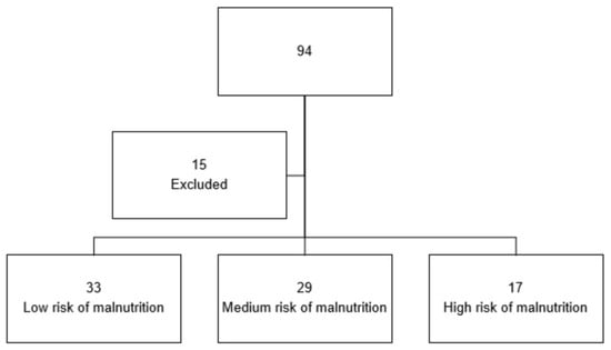 In the total sample of 79 patients, 33 (41.77%) had a low malnutrition risk, 29 (36.70%) had a moderate malnutrition risk, and 17 (21.51%) had a high malnutrition risk (Figure 2).