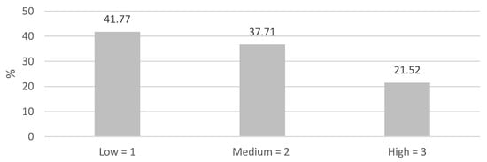 Sample percentage in the three malnutrition risk categories. Legend. The figure represents the frequency of malnutrition risk categorized into three groups according to the Likert scale: low malnutrition risk = 1; moderate malnutrition risk = 2; high malnutrition risk = 3.