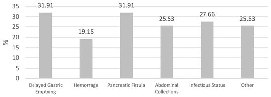 Specifically, 15 users (31.91%) experienced delayed gastric emptying (DGE); 9 users (19.15%) had postoperative bleeding; 15 users (31.91%) developed pancreatic fistula; 12 users (25.53%) had abdominal collections; 13 users (27.66%) presented with infections; and 12 users (25.53%) experienced other complications (postoperative diabetes, pancreatitis, functional and organic decline, acute renal and respiratory failure, postoperative ascites, or acute myocardial infarction). Overall, there were no significant differences between the nutritional risk classes and postoperative complications (p = 0.874) (Table 2).