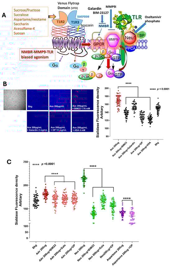 Figure 1A highlights how T1R2/T1R3 sweetener GPCR can facilitate its signaling in forming an oligomeric GPCR complex with partner glycosylated receptors. Here, we performed a live cell fluorometric assay for sialidase activity on a live RawBlue macrophage cell line, each treated with optimal doses of high-intensity sweeteners (aspartame, acesulfame-potassium (Ace-K), neotame, advantame). We also performed a fluorometric assay on the cells treated with an optimum dose of sweetener with oseltamivir phosphate (OP) and acetylsalicylic acid (ASA), galardin and BIM23127 and MMP-9i at optimal inhibitory doses, as previously reported [6]. Here, all inhibitors had a significant effect on inhibiting sialidase activity on acesulfame-potassium, neotame and aspartame sweetener-stimulated live RawBlue macrophage cells at indicated concentrations of the agonists (Figure 1B,C).
