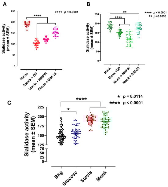 As shown in Figure 2A, stevia and monk sweeteners induced a markedly significant sialidase activity compared to the control background, while glucose induced a minimally significant sialidase activity. Furthermore, Neu-1-specific inhibitor OP, MMP-9i and BIM23127 significantly inhibited stevia and monk-induced sialidase activity (Figure 2B,C). These data support the concept that natural sweeteners promote oligomeric functional selectivity of T1R2/T1R3 GPCR-biased heteromers.