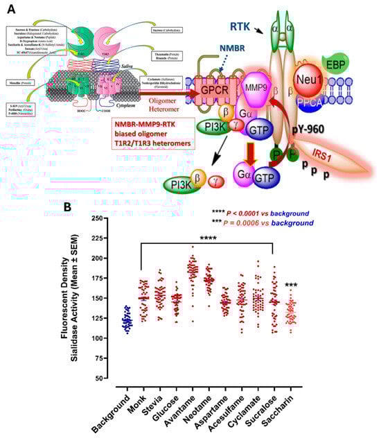 (A) Molecular signaling platform reveals an oligomeric selectivity of T1R2/T1R3 GPCR-biased functional heteromers with NMBR to induce the RTK activation signaling axis. This signaling platform potentiates MMP-9 and Neu-1 crosstalk on the cell surface, which is essential for activating RTK. Citation: Taken in part from DuBois [12] Physiology & Behavior 2016, 164, 453–463, Publisher and licensee Elsevier. and Liauchonak et al. [4] Nutrients 2019, 11, 644, Publisher and licensee MDPI. This is an Open Access article which permits unrestricted non-commercial use, provided the original work is properly cited. (B) Sialidase activity is associated with natural and artificial sweeteners treatment of live pancreatic PANC-1 cancer cells.