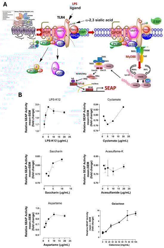 (A) Sweetener T1R2/T1R3 GPCR agonists activate NMBR GPCR tethered to TLR4 and MMP-9 to induce Neu-1 sialidase in macrophage cells. Citation: Taken in part from Abdulkhalek et al. [6] Cellular signalling 2012, 24, 2035–2042. Publisher and licensee Elsevier. This is an Open Access article which permits unrestricted non-commercial use, provided the original work is properly cited. (B) Artificial and natural sweeteners induce NFκB-Dependent SEAP activity in live RawBlue macrophage cells.