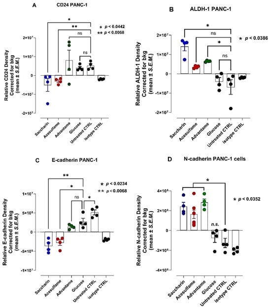 Analyses of pancreatic PANC-1 cancer cells for (A) CD24 and (B) ALDH1A1 stem-like markers and (C) E-and (D) N-cadherin EMT markers following 24 h exposure to saccharin, acesulfame, advantame and glucose using immunocytochemistry analyses. ns = non-significant.