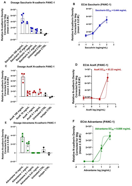 The data depicted in Figure 5D revealed that the artificial sweeteners saccharin, acesulfame, and advantame induced a significant expression of N-cadherin in PANC-1 pancreatic cancer cells. Here, we investigated the potency of the sweetener by grading the dose-response curve and calculating the half-maximal effective concentration (EC50) for each of the sweeteners to induce N-cadherin expression. The data in Figure 6 reveal differential half-maximal effective concentration values for saccharin (EC50 = 6.446 mg/mL, 35.2 mM), acesulfame (EC50 = 83.23 mg/mL, 413.5 mM), and advantame (EC50 = 9.899 mg/mL, 72.7 mM) to express N-cadherin for PANC-1 invasion and metastasis.