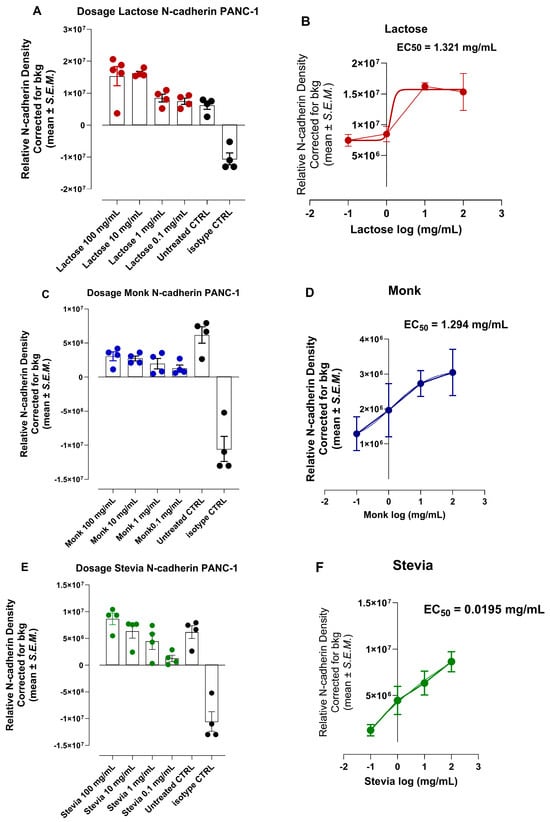 Half maximal effective concentration (EC50) of natural sweeteners (A,B) lactose, (C,D) monk and (E,F) stevia to induce an invasive epithelial-mesenchymal transition (EMT) N-cadherin expression following 24 h exposure using immunocytochemistry analyses.