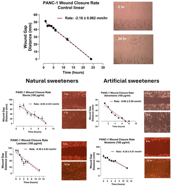 Natural (stevia and lactose) and artificial (advantame and neotame) sweeteners enhance the migratory potential of PANC-1 cancer cells using the scratch wound assay. The wound closure rate of untreated PANC-1 cells was over 24 h. The best-fit slope represents the rate in mm/hr of wound closure.
