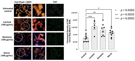 PANC-1 cells were cultured and individually grown in a sterile 24-well plate on 12 mm circular glass coverslips containing the conditioned medium for 24 h. Cells were media-starved and incubated with predetermined indicated concentrations of the sweeteners (lactose, neotame, and stevia) in the designated wells for 24 h after reaching 70% confluency. Control wells were incubated with media without FBS. The cells were washed 1x with PBS, treated with Invitrogen CellMask Plasma Membrane Stain (C10045, Thermo Fisher Scientific) and fixed at 4% PFA (300 µL) before being incubated at 4 °C for 24 h. Following this, cells were washed 3 times with PBS-Tween 20 and mounted on microscope slides using 3 μL of VECTASHIELD DAPI fluorescent mounting medium (VECTH1500, MJS BioLynx Inc. 300 Laurier Blvd, K6V 5W1, Brockville, ON, Canada). Slide images were observed using Zeiss M2 epi-fluorescent microscopy (20× magnification, Carl Zeiss Canada Ltd., M3B 2S6 Toronto, ON, Canada), capturing images under the Rhodamine (554 nm) channel. The images were enhanced, and the cell projections were differentiated on ImageJ. The projections were quantified using Corel Photo-Paint. For statistical analysis, we used GraphPad Prism 10. Comparisons between groups from two independent experiments used a one-way analysis of variance (ANOVA) at 95% confidence, followed by Fisher’s uncorrected LSD multiple comparisons post hoc test with 95% confidence. Asterisks denote statistical significance.