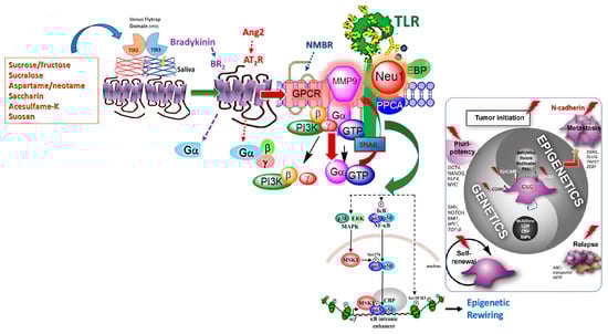 NNS continues to be used as a staple in the Western diet. However, its impacts on health-related safety are poorly studied and understood. Here, we have uncovered a new signaling paradigm for these receptors and cell responses, which could represent a common metabolic target with pro-inflammatory responses. The relationship between sweetener-induced TIR2/TIR3 receptor signaling to activate RTK and TLR receptors could explain the signaling pathways that result in insulin resistance, diabetes, cancer, and metastasis. In turn, the mechanisms leading to diet-induced epigenetic rewiring-inducing metabolic changes contributing to diabetes, metabolic syndrome, tumorigenesis, and metastatic disease can be assessed in future studies (Figure 11). Shigemura et al. [42] demonstrated that the expression of AngII GPCR receptors interacts with T1R3 GPCR in taste tissues and gustatory nerve and behavioral responses to taste stimuli after administration of AngII in mice, depicted in Figure 11. This concept elegantly substantiates the conceptual framework proposing the activation of the biased T1R2/T1R3 GPCR-Neu-1-MMP-1 signaling platform by a select group of sweeteners activating the NF-κB pathway and subsequent epigenetic remodeling, implicated in enhanced EMT markers and metastasis [43]. Although the role of the T1R2/T1R3 GPCR-Neu-1-MMP-9 signaling platform and the associated activation of NF-κB has yet to be studied concerning cancer epigenetics and metastasis, NF-κB presents a significant potential as a mediator of epigenetic effects induced by sweeteners.